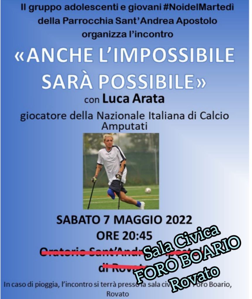 Il gruppo adolescenti e giovani #NoidelMartedì della Parrocchia Sant’Andrea Apostolo organizza l’incontro “ANCHE L’IMPOSSIBILE SARA’ POSSIBILE” con Luca Arata, giocatore della Nazionale Italiana di Calcio Amputati.