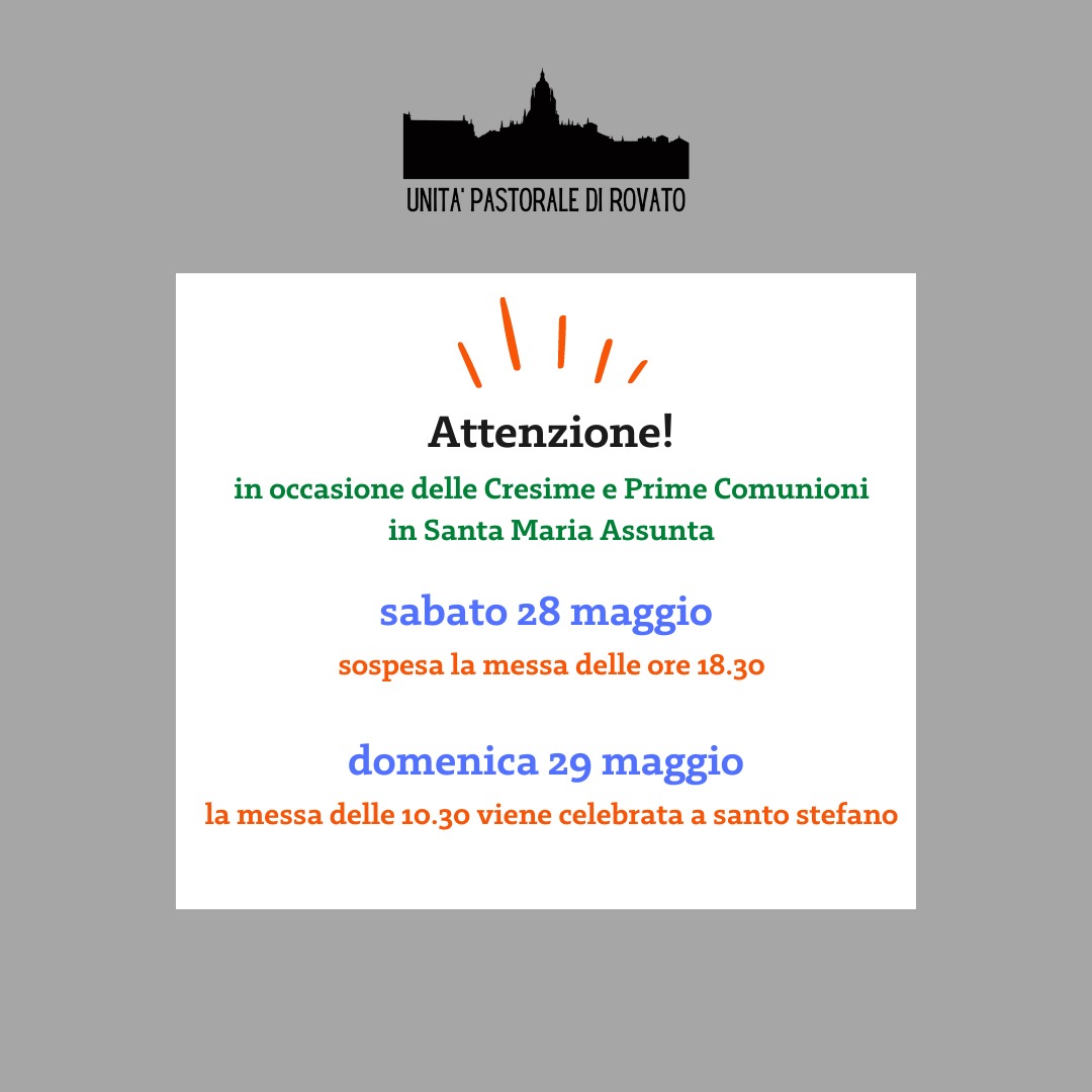 In occasione delle Cresime e delle Prime Comunioni in Santa Maria Assunta, sabato 28 maggio la S. Messa delle 18.30 è sospesa e la S. Messa di domenica 29, delle ore 10.30, sarà celebrata in Santo Stefano.