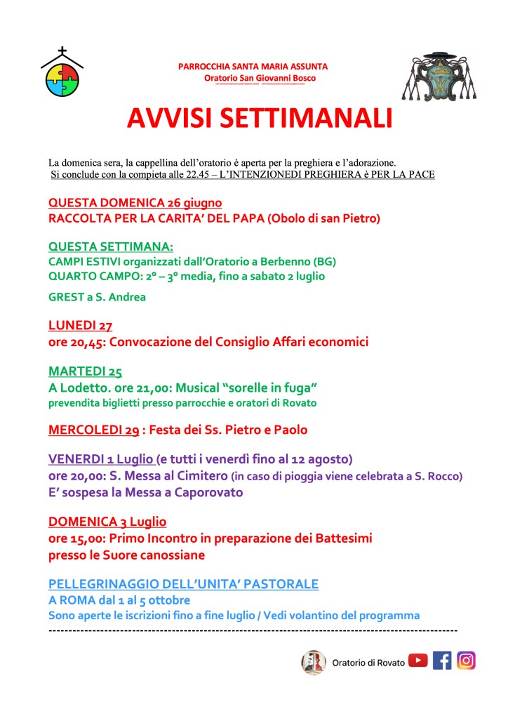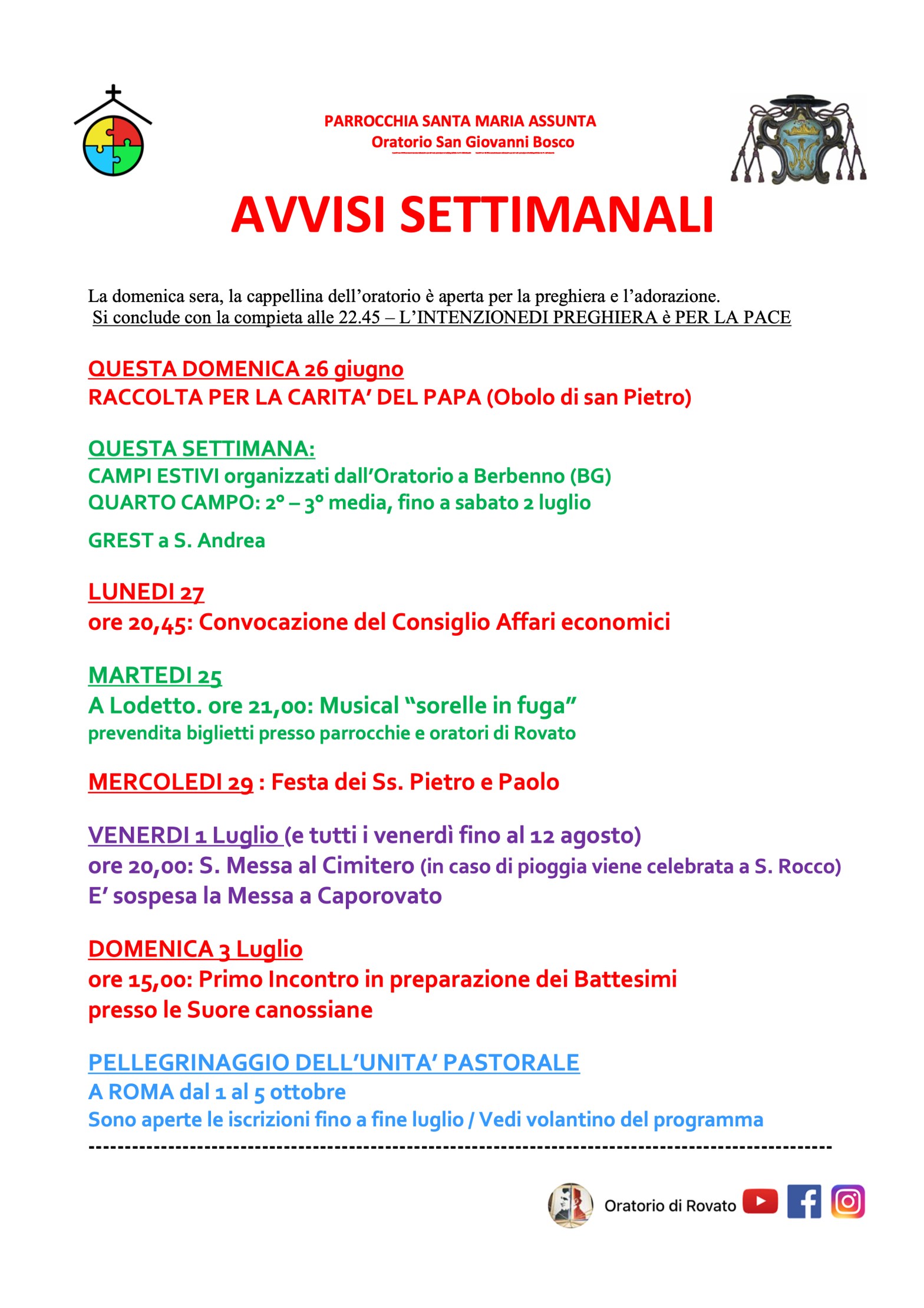 Avvisi settimanali dal 26 Giugno al 3 Luglio