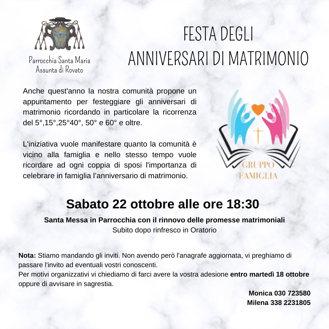 Anche quest’anno la nostra comunità propone un appuntamento per festeggiare gli anniversari di matrimonio ricordando in particolare la ricorrenza del 5°,15°,25°40°, 50° e 60° e oltre.