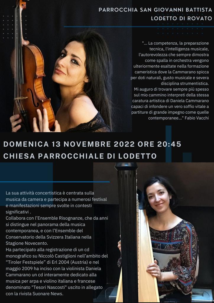 In occasione della Festa della Madonna del Lodetto, si terrà presso la Chiesa Parrocchiale San Giovanni Battista del Lodetto un Concerto di Violino e Arpa, domenica 13 novembre 2022 alle ore 20.45.