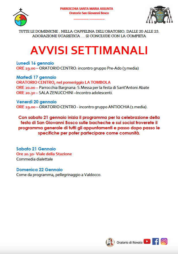 Sabato 21 Gennaio ore 20.30 presso l’Oratorio del Viale della stazione (San Giovanni Bosco)