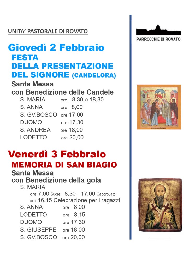 ORARI SANTE MESSE DEL 2 E 3 FEBBRAIO