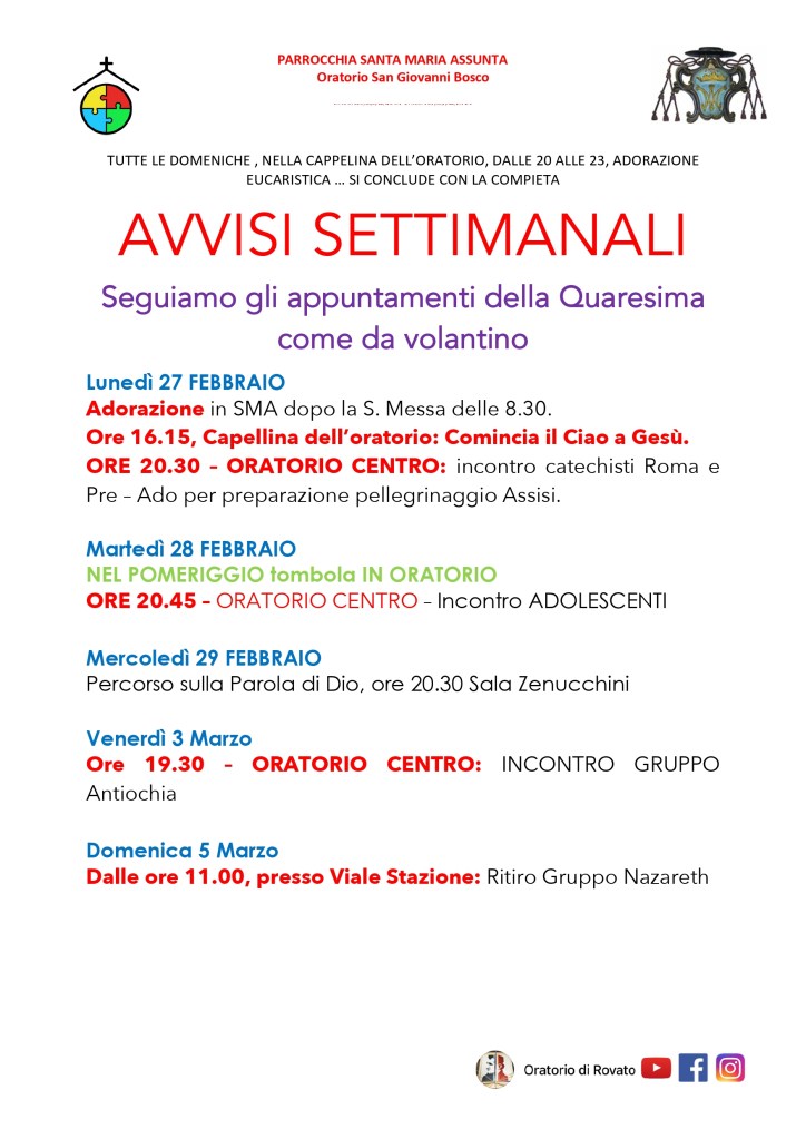 Il calendario, con tutti i principali appuntamenti aggiornati dell’Unità Pastorale di Rovato, è sempre consultabile nell’apposita pagina AGENDA
