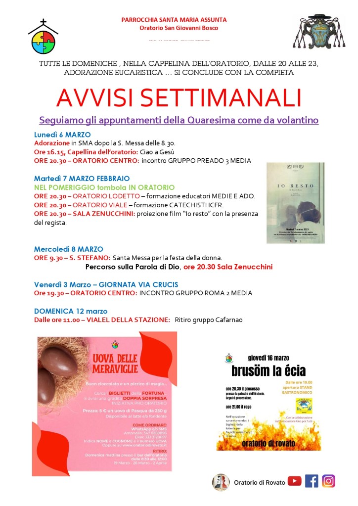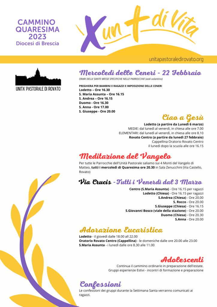 Il calendario, con tutti i principali appuntamenti aggiornati dell’Unità Pastorale di Rovato, è sempre consultabile nell’apposita pagina AGENDA