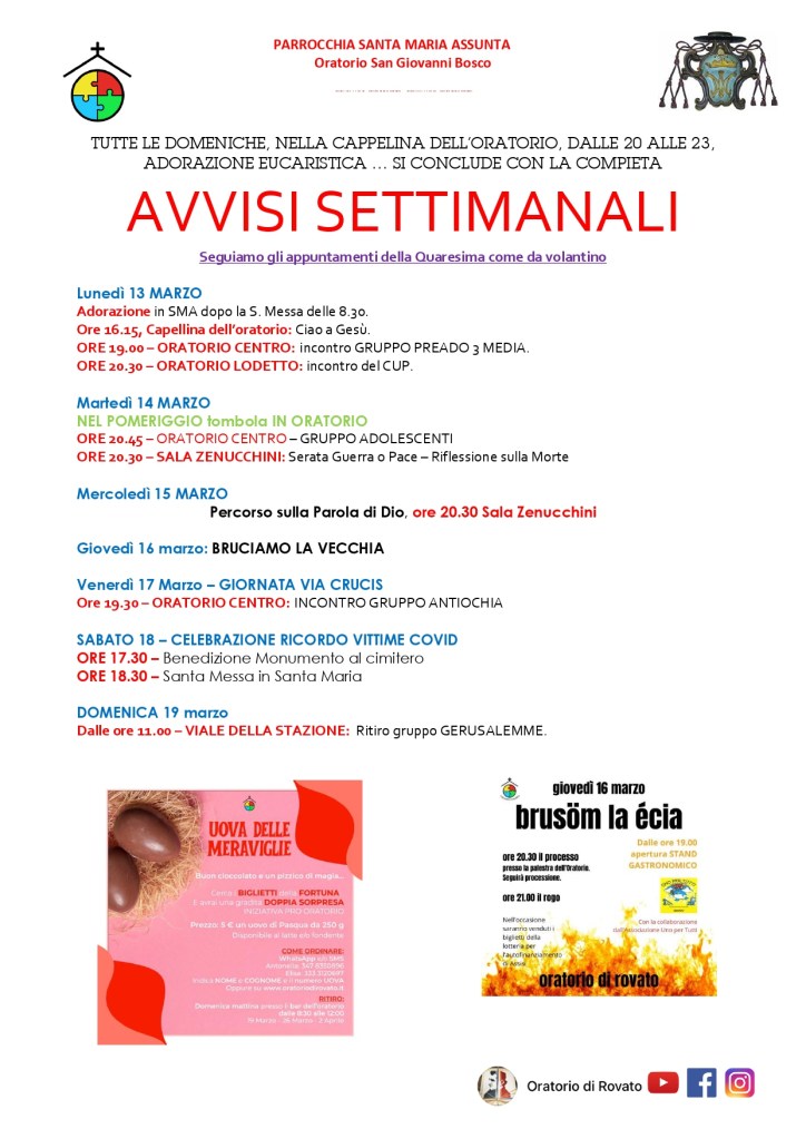 Il calendario, con tutti i principali appuntamenti aggiornati dell’Unità Pastorale di Rovato, è sempre consultabile nell’apposita pagina AGENDA