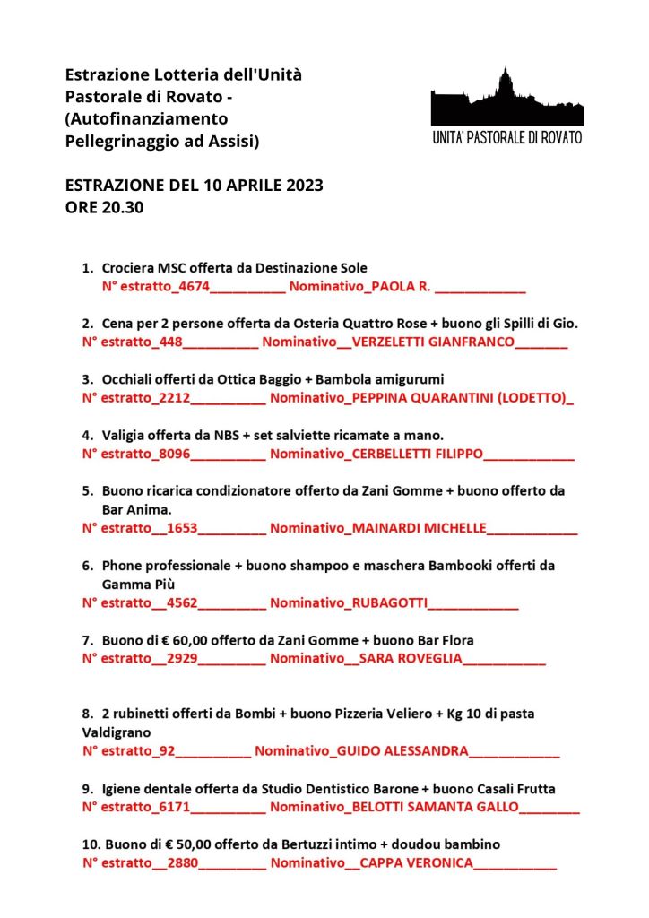 Estrazione Lotteria dell’Unità Pastorale di Rovato – (Autofinanziamento Pellegrinaggio ad Assisi).