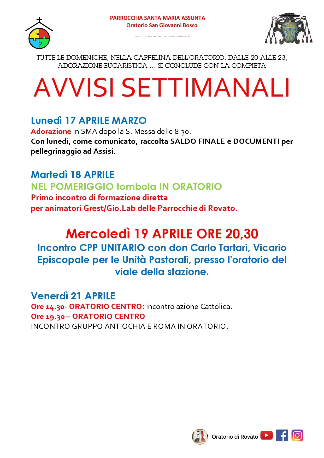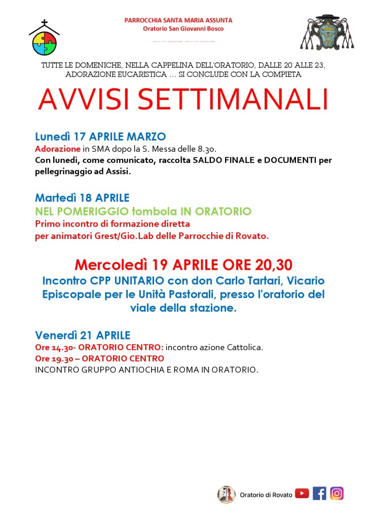 Il calendario, con tutti i principali appuntamenti aggiornati dell’Unità Pastorale di Rovato, è sempre consultabile nell’apposita pagina AGENDA