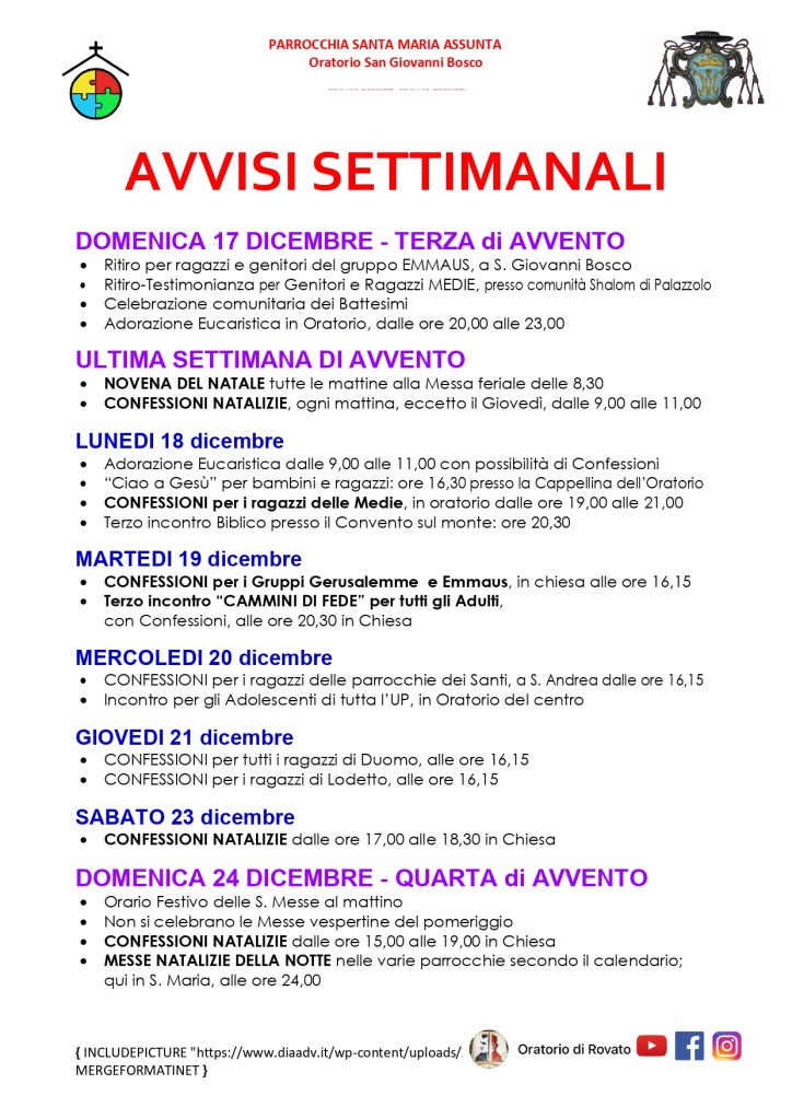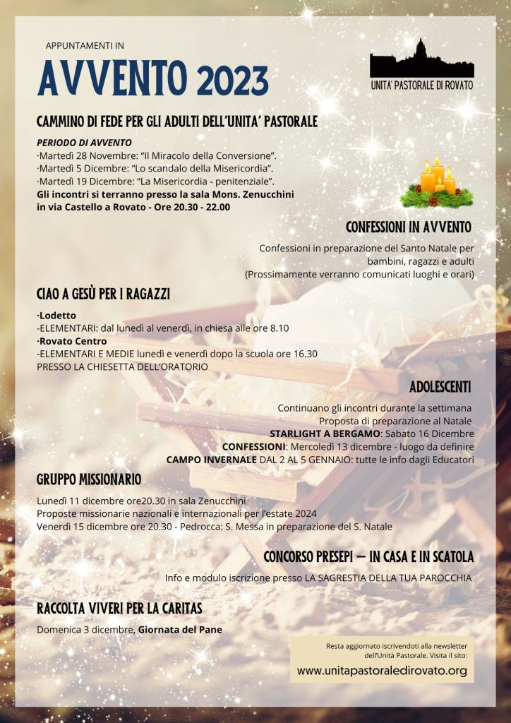 Il calendario mensile, con tutti i principali appuntamenti aggiornati dell’Unità Pastorale di Rovato, è sempre consultabile nell’apposita pagina AGENDA