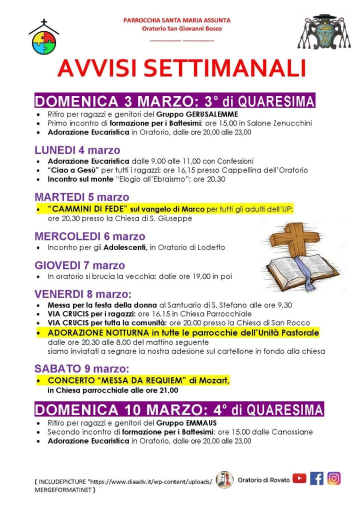 Il calendario mensile, con tutti i principali appuntamenti aggiornati dell’Unità Pastorale di Rovato, è sempre consultabile nell’apposita pagina AGENDA