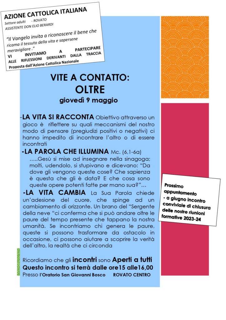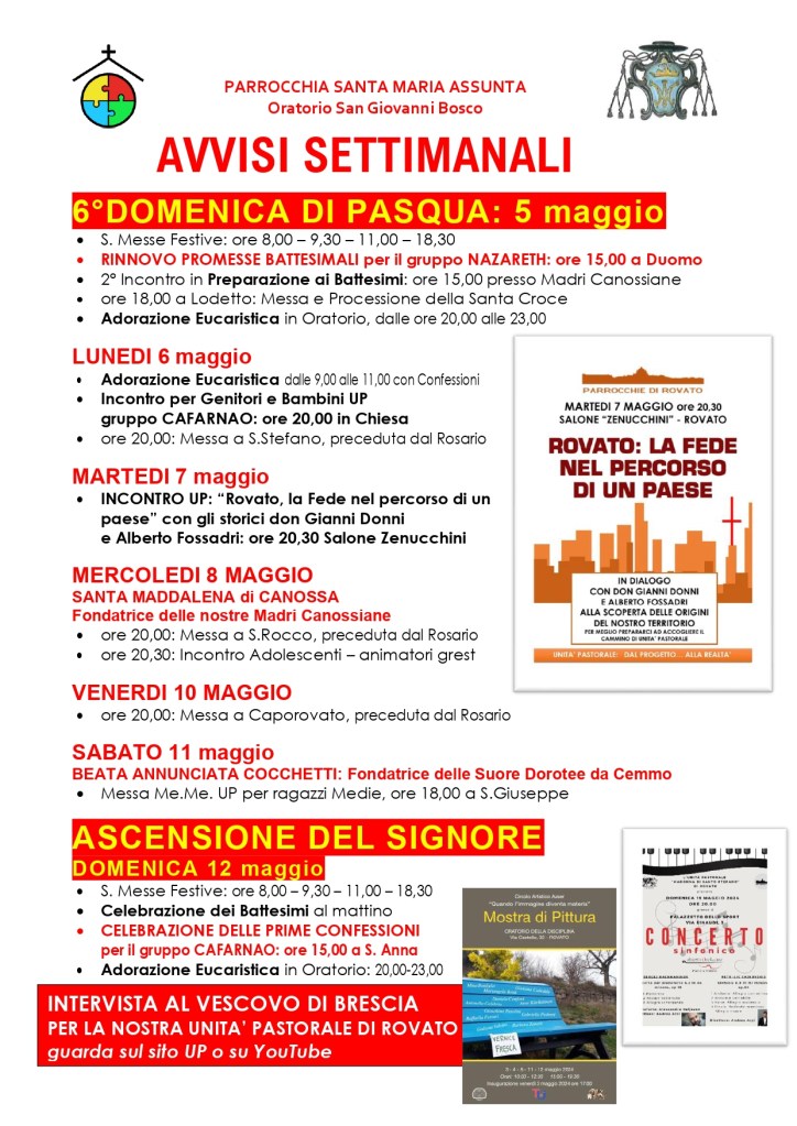 Il calendario mensile, con tutti i principali appuntamenti aggiornati dell’Unità Pastorale di Rovato, è sempre consultabile nell’apposita pagina AGENDA