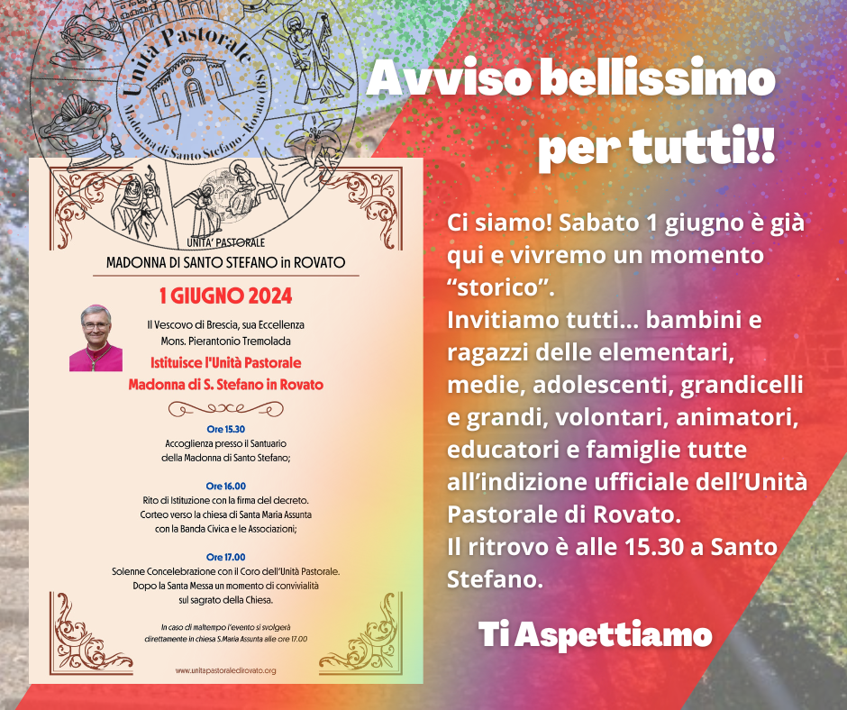 Unità Pastorale di Rovato – Intervista al Vescovo di Brescia, sua eccellenza Mons. Pierantonio Tremolada, in occasione dell’imminente indizione dell’Unità Pastorale di Rovato del 1 Giugno 2024. L’intervista a cura di Don Giuseppe Baccanelli e di tutti i preti di Rovato, è stata eseguita presso il Centro Pastorale Paolo VI di Brescia il 24 aprile 2024.
