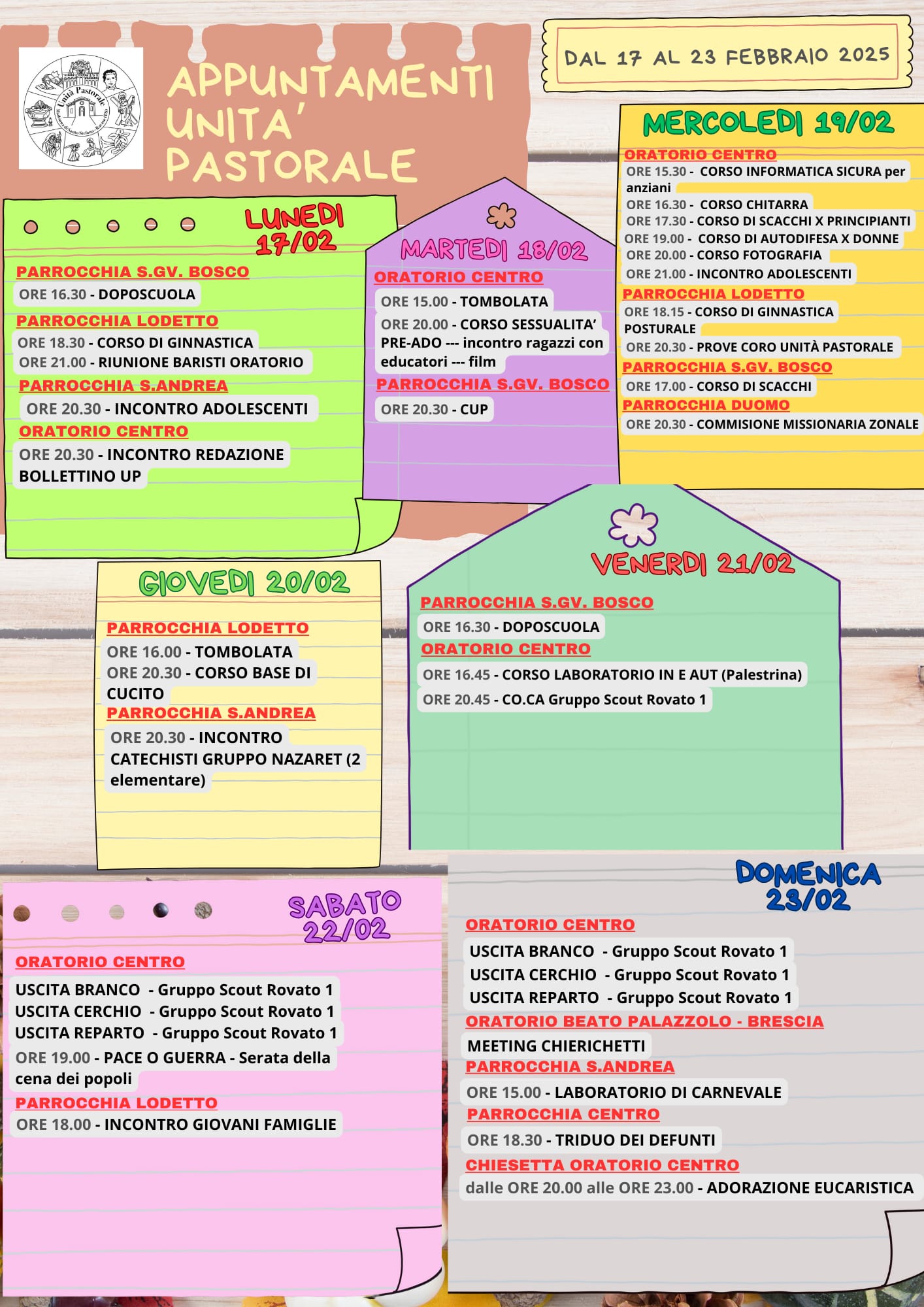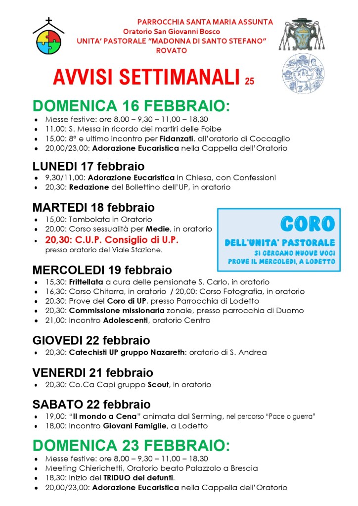 Il calendario mensile, con tutti i principali appuntamenti aggiornati dell’Unità Pastorale di Rovato, è sempre consultabile nell’apposita pagina AGENDA