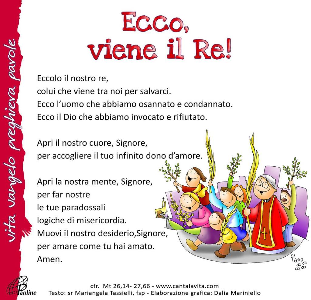 Lo condussero allora da Gesù; e gettati i loro mantelli sul puledro, vi fecero salire Gesù. Mentre egli avanzava, stendevano i loro mantelli sulla strada. Era ormai vicino alla discesa del monte degli Ulivi, quando tutta la folla dei discepoli, pieni di gioia, cominciò a lodare Dio a gran voce per tutti i prodigi che avevano veduto, dicendo: