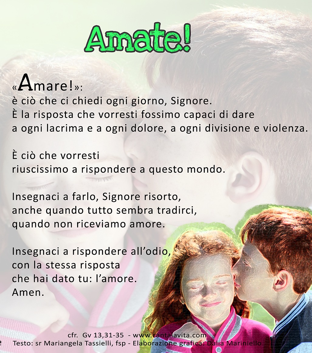 Figlioli, ancora per poco sono con voi. Vi do un comandamento nuovo: che vi amiate gli uni gli altri. Come io ho amato voi, così amatevi anche voi gli uni gli altri.