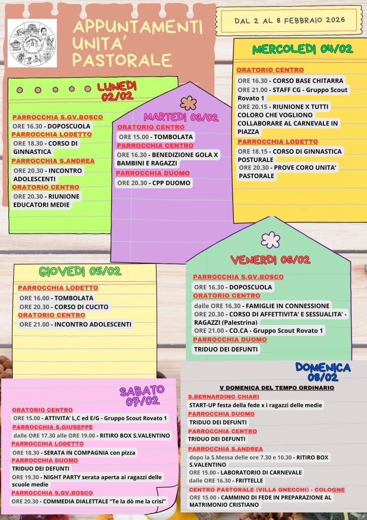 Il calendario mensile, con tutti i principali appuntamenti aggiornati dell’Unità Pastorale di Rovato, è sempre consultabile nell’apposita pagina AGENDA