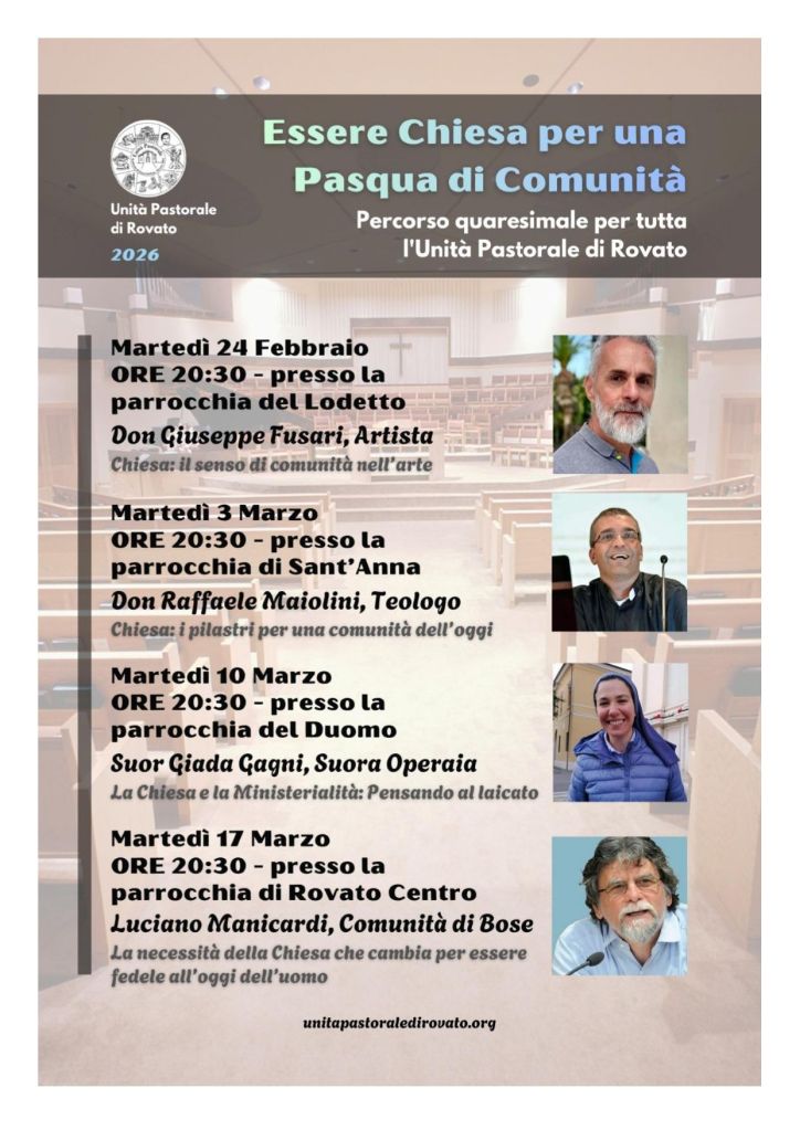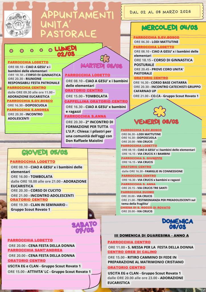 Il calendario mensile, con tutti i principali appuntamenti aggiornati dell’Unità Pastorale di Rovato, è sempre consultabile nell’apposita pagina AGENDA