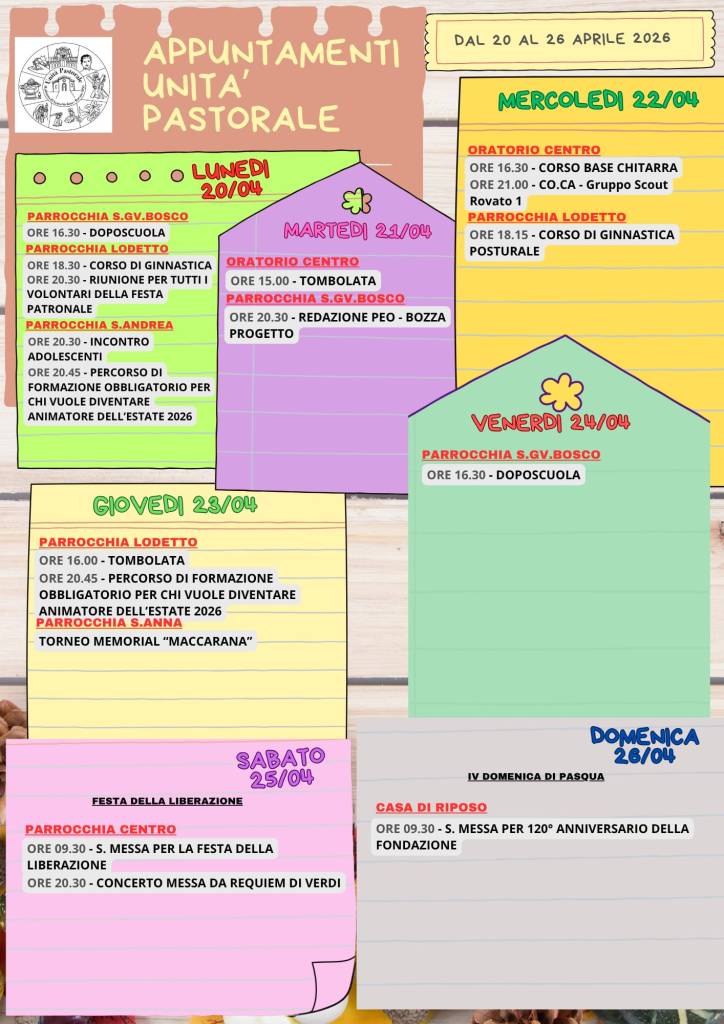 Il calendario mensile, con tutti i principali appuntamenti aggiornati dell’Unità Pastorale di Rovato, è sempre consultabile nell’apposita pagina AGENDA