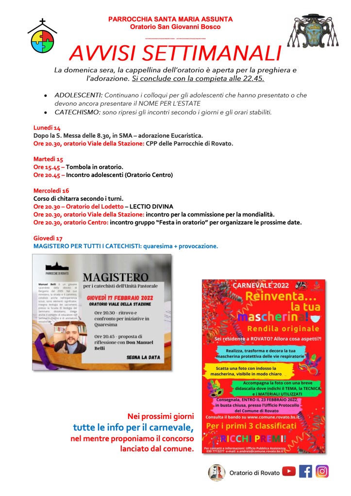 Avvisi settimanali Oratorio di Rovato dal 13 al 20 febbraio 2022