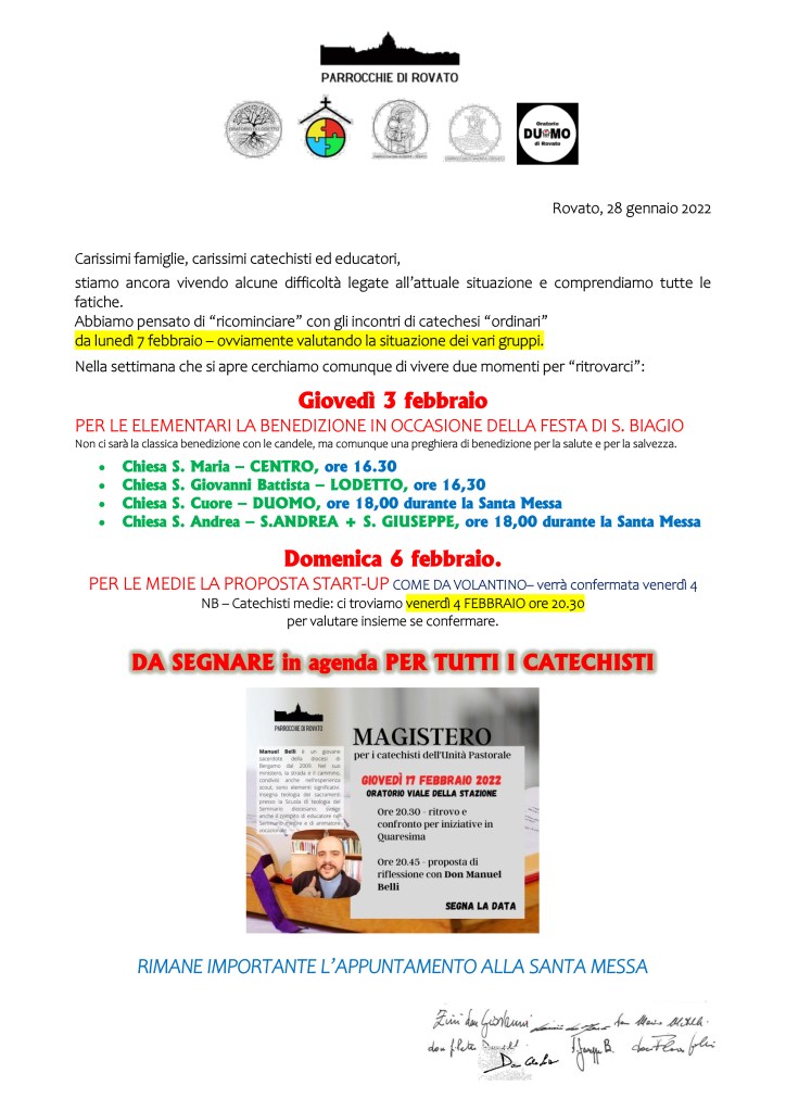 Avvisi settimanali dal 30 gennaio al 6 febbraio 2022