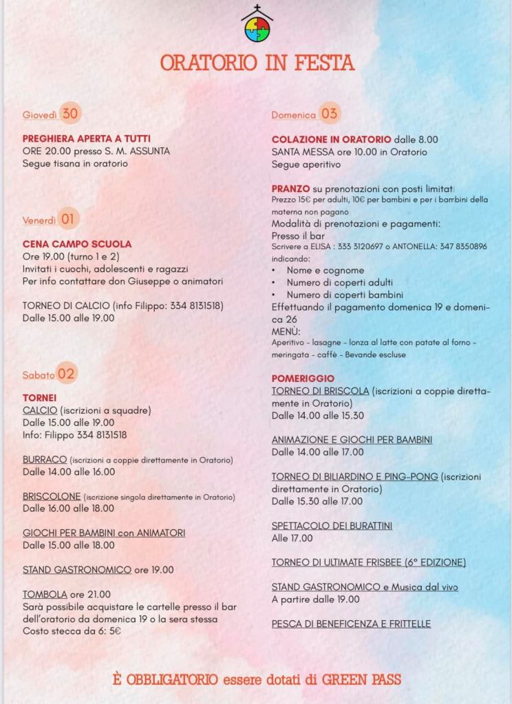 Pubblichiamo il programma definitivo del calendario dell’oratorio in Festa.
