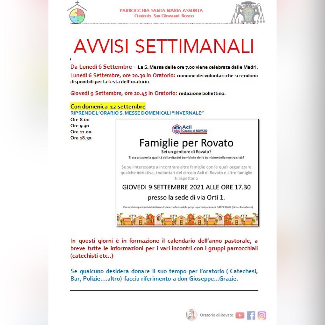 Cambio orario messe ed avvio formazione calendario pastorale.