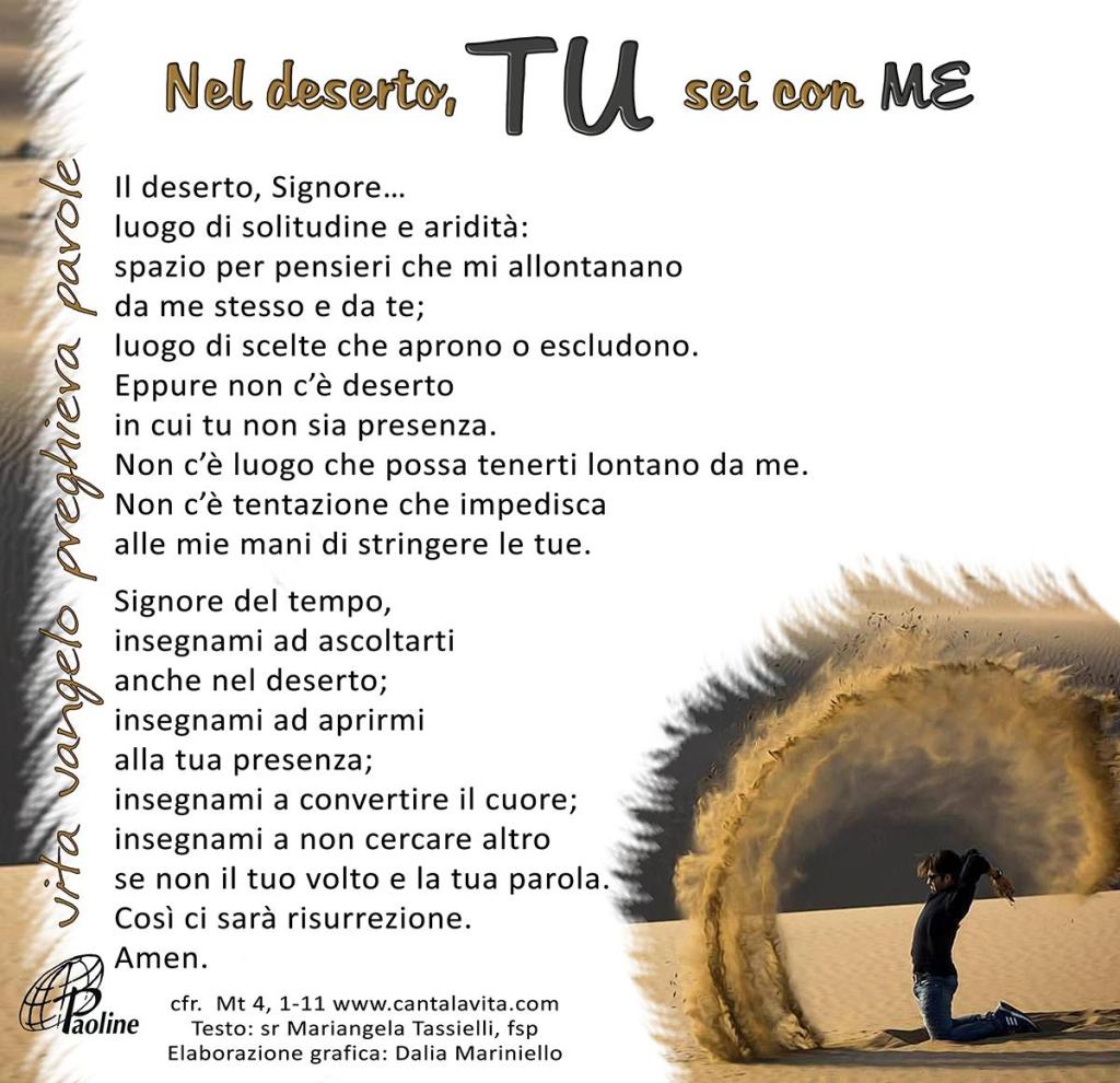 In quel tempo, Gesù fu condotto dallo Spirito nel deserto, per essere tentato dal diavolo. Dopo aver digiunato quaranta giorni e quaranta notti, alla fine ebbe fame. Il tentatore gli si avvicinò e gli disse: «Se tu sei Figlio di Dio, di’ che queste pietre diventino pane». Ma egli rispose: «Sta scritto: “Non di solo pane vivrà l’uomo, ma di ogni parola che esce dalla bocca di Dio”».