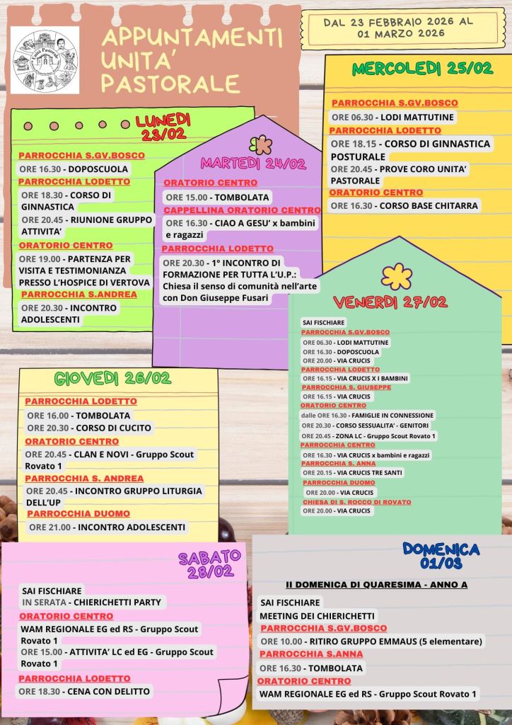 Il calendario mensile, con tutti i principali appuntamenti aggiornati dell’Unità Pastorale di Rovato, è sempre consultabile nell’apposita pagina AGENDA