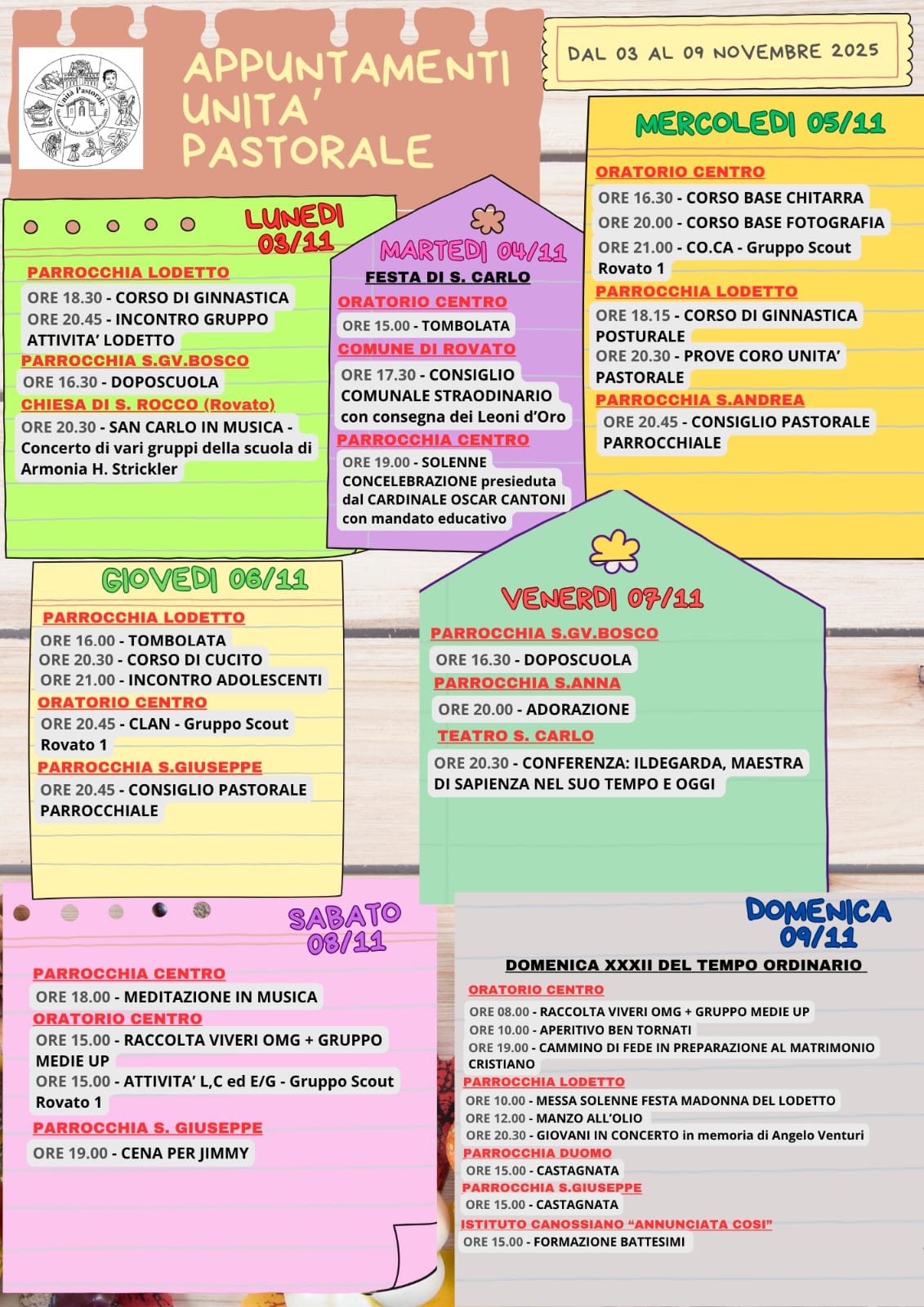 Il calendario mensile, con tutti i principali appuntamenti aggiornati dell’Unità Pastorale di Rovato, è sempre consultabile nell’apposita pagina AGENDA