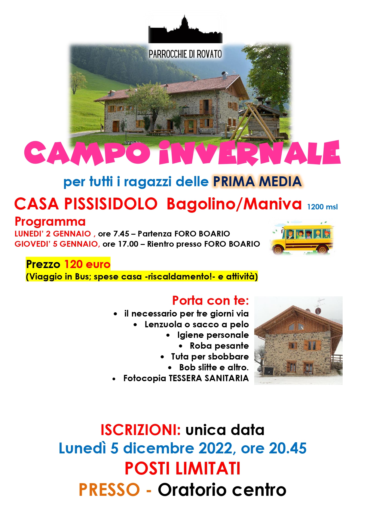Campo Invernale a Bagolino, casa Pissisidolo, per tutti i ragazzi della Prima Media, dal 2 al 5 gennaio 2023.
